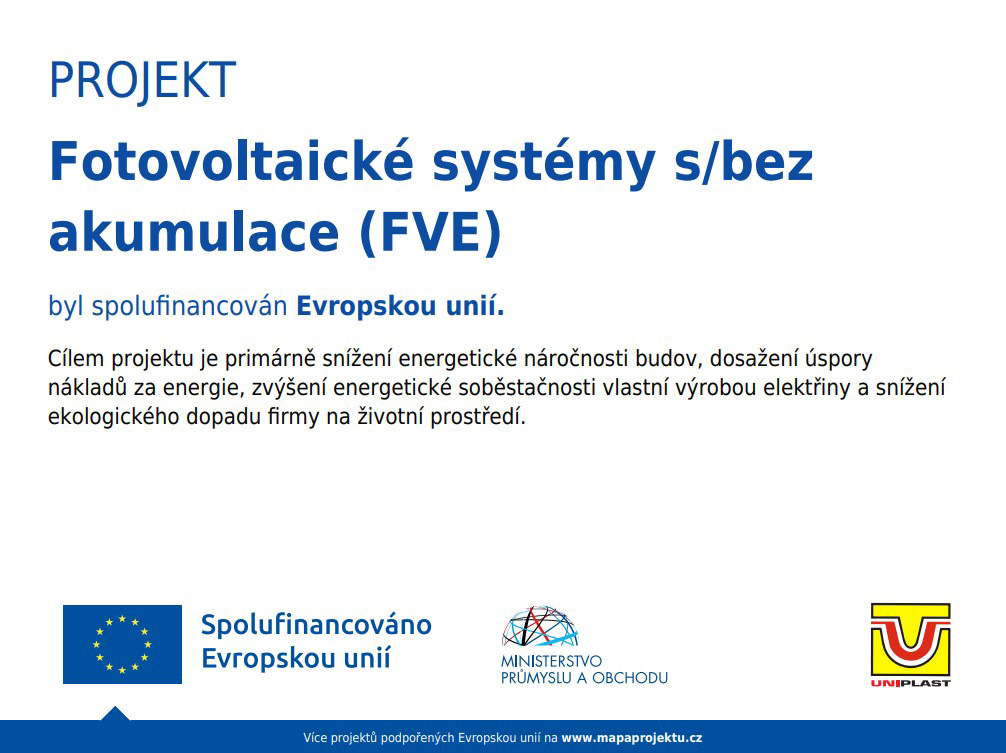 Na přelomu let 2025 a 2026 jsme za pomoci spolufinancování EU nainstalovali fotovoltaický systém, díky němuž bude firma schopna značně snížit energetickou náročnost budov. Dosáhneme tak úspory nákladů za energie, zvýšení energetické soběstačnosti vlastní výrobu elektrřiny a snížení ekologického dopadu na životní prostředí využíváním obnovitelných zdrojů.